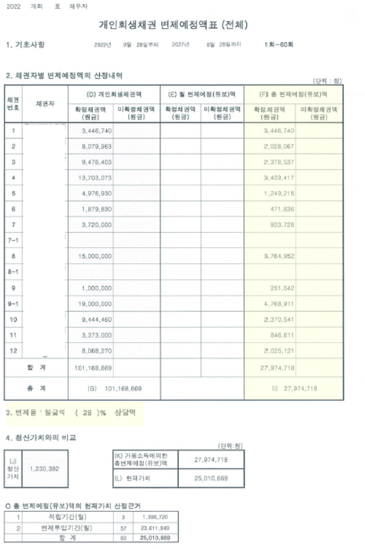 박00변제기간2022년 9월 ~ 2027년 8월(60개월/5년)총 채무101,168,669변제금466,240총 변제금27,974,718탕감금액73,193,951원금의 72% 탕감 박00님은 어린시절부터 어려운 가정에서 자랐으며 늘 학비가 밀려 청소를 하고 하교를 하였으며 집에 가면 사채업자들이 새벽까지 찾아와 잠을 못 이뤘습니다. 어려운 가정환경 이였지만 부모님은 늘 따듯하셨으며 신청인은 10대때부터 아르바이트를 하며 부모님 채무를 대신 변제하였습니다. 학비를 모으지 못하고 학자금대출만 실행되어 군복무기간동안에 신용불량자가 되었으며 군입 급여 또한 압류가 되었습니다. 전역 후 워크아웃을 통해 성실히 본인의 채무와 부모님 채무를 변제하였으나 코로나 19바이러스로 인해 운영하던 사업이 폐업을 하게 되었으며 결국 개인회생에 이르게 되었습니다.
