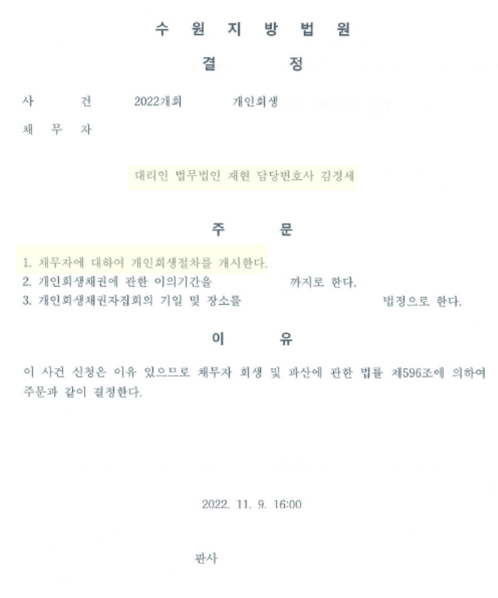 *2022.07.25. 접수 → 2022.11.09. 개시결정원금의 72% 탕감 성공!