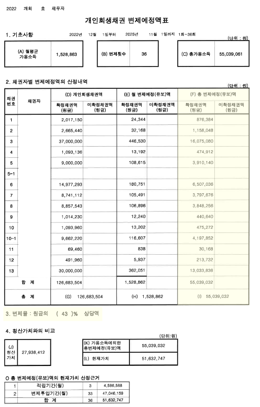 [김00님의 특이사항] 1) 최근 1년 이내 채무가 없음2) 지인에게 대여해 준 금원 모두 청산가치에 반영 김00변제기간2022년 12월 ~ 2025년 11월(36개월/3년)총 채무126,683,504변제금1,528,863총 변제금55,039,061탕감금액4,447,939원금의 57% 탕감 김00님은 대학교에서 방사선을 전후 바로 사회에 나와 근로활동을 하였습니다. 밤낮없이 열심히 노력한 끝에 남들보다 일찍 사무장으로 진급하고 이후에는 종합병원 기획실장으로 오르게 되었습니다. 상승세로 이어지던 신청인의 앞날이었으나 병원 원장과 이사들의 이중 계약으로 인해 개원이 무너졌고 이로 인해 1년간 채권사들의 추심에 시달리며 노숙 생활을 하였습니다. 그러던 중 전 직장에서 다시 근무할 수 있는 기회가 생겼고 새 출발을 하여 23년간 성실히 근무를 하였습니다. 하지만 갑작스럽게 해고를 당하였습니다. 한순간에 직장을 잃은 신청인은 생활비 및 자녀들의 교육비가 부족하였고 이로 인해 대출을 받게 되었습니다. 대출은 또 다른 대출을 낳게 되었고 이자는 지속적으로 늘어나 신청인 홀로 감당할 수가 없어서 결국에는 개인회생에 이르게 되었습니다.