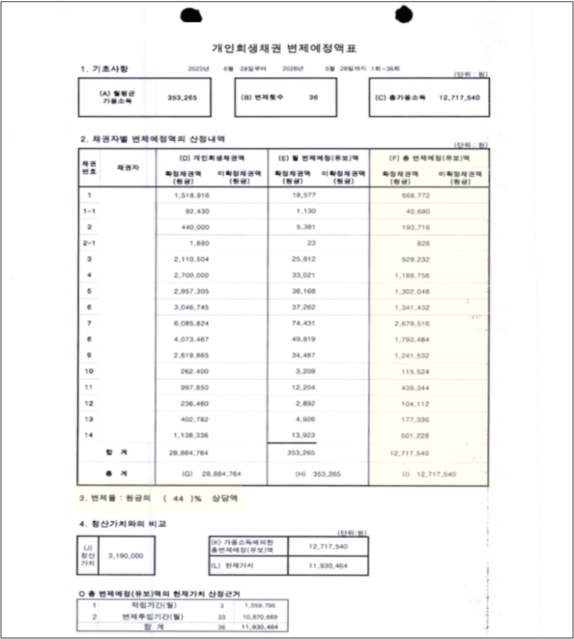 신청인의 경우 채무 중 사금융 대출건으로 인해 원금보다 이자 금액이 더 많았고, 발급받아 사용한 모든 신용카드, 금융계좌 거래내역서를 제출해야 했습니다. 또한 최근 취업으로 법원에서 소득 자료를 정리하여 제출하라는 권고가 있었습니다. 제출해야 할 서류가 많아 다소 어렵게 느껴질 수 있는 권고였지만, 저희 로펌만의 노련함으로 침착하게 답변하여 접수일 기준 세 달도 채 안된 시점에 원금의 절반 이상(56%)을 탕감받는 계획안으로 개시결정을 받을 수 있었습니다.