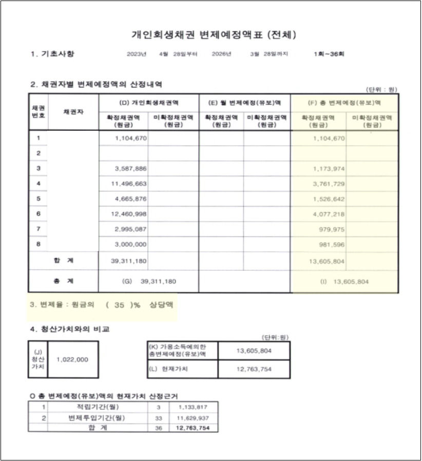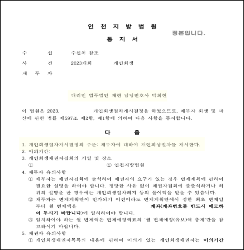 신청인의 경우 적은 급여와 관련하여 법원의 권고가 있었습니다. 또한 최근 채무의 비중이 높아 카드대금, 대출금 등과 관련하여 상세히 소명해야 했습니다. 법원에서 지속적으로 신청인의 적은 급여로 인해 변제수행능력에 대해 의문을 가지며 재보정을 촉구하였지만, 저희 로펌만의 노련함으로 침착하게 현재 신청인의 상황 및 급여자료, 앞으로의 변제이행계획을 구체적으로 답변하는 보정서를 제출하여 접수일 기준 네 달도 채 안된 시점에 원금의 65%를 탕감받는 계획안으로 개시결정을 받을 수 있었습니다.