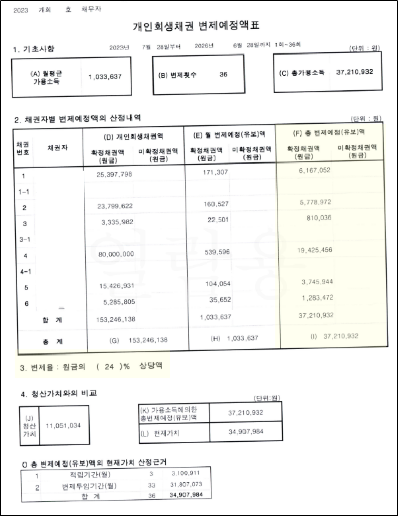 신청인의 경우 전세보증금에 대하여 모두 청산가치에 반영되어야 했으나, 전세사기 피해로 인해 보증금 반환을 받지 못하는 사유에 관하여 진술서 및 고소장 및 사건내역, 피해자 선정내역 등을 제출함에 따라 현재의 신청인의 상황을 법원에 충분히 소명하여 청산가치에 반영하지 않고 소득에 대하여도 감소한 사유를 소명하여 접수일 1달만에 원리금의 76%를 탕감받는 계획안으로 개시결정을 받게되었습니다.