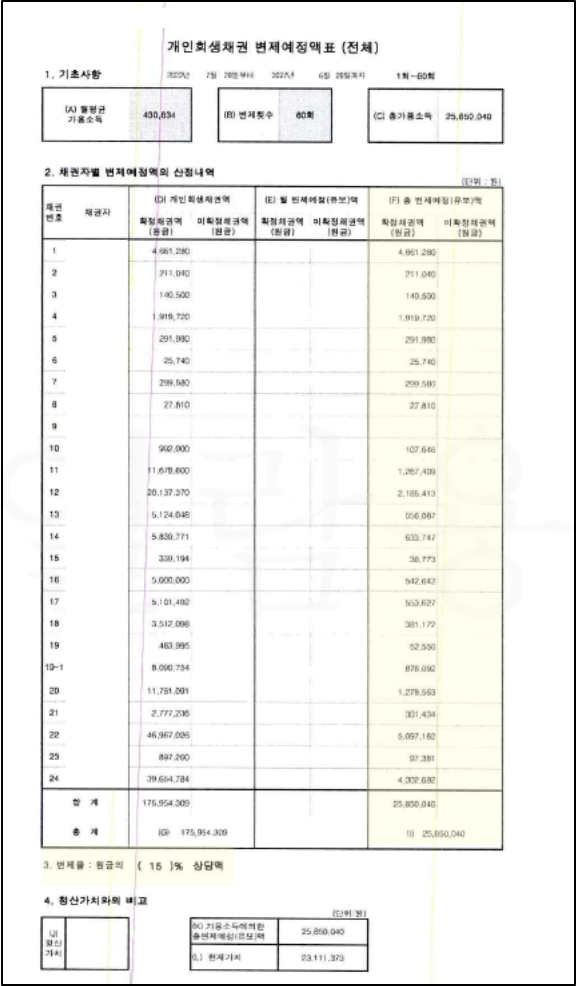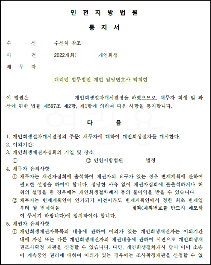 신청인의 경우 재신청이기에 종전 사건과 현재의 상황에 관해 비교하는 까다로운 소명과 최근 취업 및 종전에 비해 현재 소득이 현저히 낮은 점, 우선 채권을 제외한 일반 채권자의 변제율이 상당히 낮은 점 등의 법원의 강한 이의에 따라 변제금 대폭 상향과 변제 기간 상향 권고가 있었으나 저희 로펌에서는 종전사건이 기각될 수 밖에 없었던 사유와 꾸준한 병원 치료를 받는 중에도 성실하게 근무한 신청인의 상황 등을 꼼꼼하게 준비하여 주장한 부분이 인정되어 변제금 상향 없이 원리금 85% 탕감받는 계획안으로 개시결정을 받을 수 있었습니다.