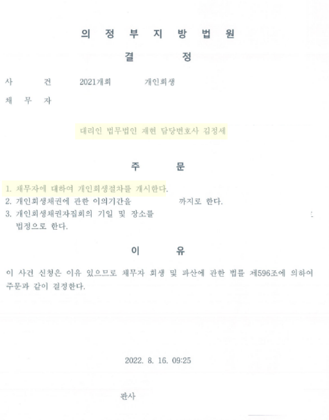 *2021.09.01. 접수 → 2022.08.16. 개시결정