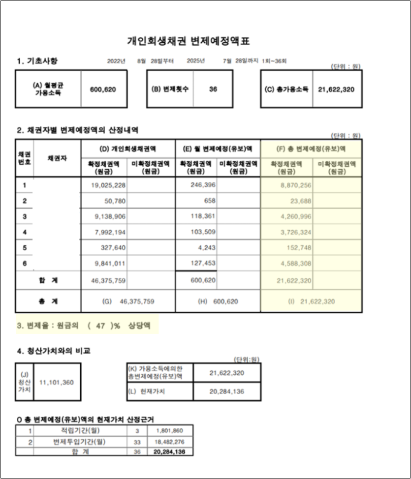박00변제기간(36개월/3년)총 채무49,043,403원변제금600,620원총 변제금21,622,320원탕감금액27,421,083원원금의 53% 탕감 박00님은 졸업 후 바로 직장생활을 시작하였습니다.하지만 생각했던 것보다 사회생활은 더 힘들었고, 무엇이 본인에게 맞는 일일지 고민하며 적성에 맞는 일도 수없이 찾아보고 고민하였습니다.하지만 박00님의 적성에 맞는 일을 바로 찾기는 어려웠고, 처음 접해보는 낯선 업무에 사람 대하는 것을 어려워하던 박00님에게는 함께 일하는 동료들과 친해지는 것도 큰 스트레스로 다가왔습니다.그러다 보니 일을 하며 자존감도 많이 떨어졌고, 직장에서 오는 스트레스를 퇴근 후 인터넷 쇼핑이나 배달음식(폭식)으로 풀곤 했습니다.처음에는 직장에서 받는 급여로 대출금을 잘 갚으며 지냈지만, 결국 적응하지 못했던 직장에서 퇴사를 반복하게 되었습니다. 그렇게 생활비가 부족하니 다른 곳에서 또 대출을 받고 돌려막기를 하게 되었습니다. 하지만 돌려막기를 해도 상황은 좋아지지 않았고, 결국 이 상황을 감당하기 힘들어져 개인회생을 신청하게 되었습니다.