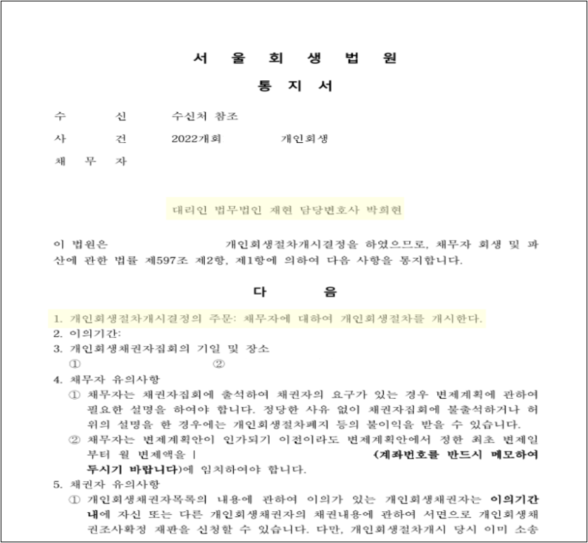 신청인의 경우 최근 발생한 채무에 대해 상세히 소명하고 해당 내역을 표로 정리하여 제출하라는 법원의 권고가 있었습니다. 또한 최근 취업이라 직장 서류가 부족하여 해당 부분에 관한 법원의 권고가 있었지만, 저희 로펌만의 노하우로 노련하게 답변하여 접수일 기준 4달도 채 되지 않은 시점에 두 번의 보정권고만으로 신속한 개시결정을 받을 수 있었습니다.