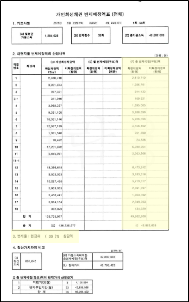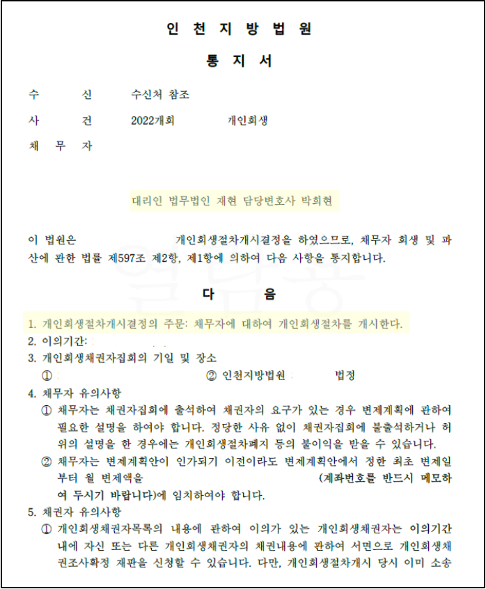 신청인의 경우 배우자와의 오랜 별거로 인해 배우자의 서류 준비가 어려웠습니다.이에 각 기관에 사실조회를 신청하여 회신받아 제출하였으며, 매월 배우자에게 생활비 및 양육비를 이체하고 있어 이에 관한 이체 내역 등을 제출하며 현재 신청인의 상황을 최대한 주장하여 추가 생계비로 인정받아 원리금 85% 탕감받는 계획안으로 개시결정을 받을 수 있었습니다.