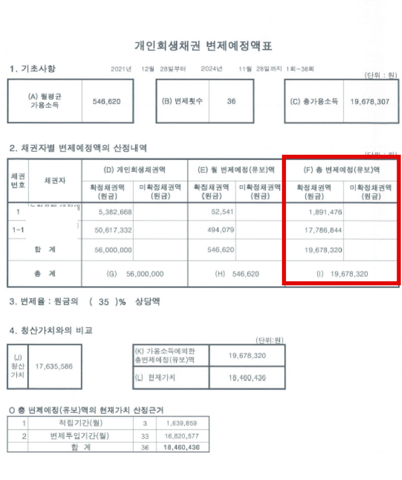 이00변제기간2021년 12월 ~ 2024년 11월(36개월/3년)총 채무56,000,000변제금546,620총 변제금19,678,307탕감금액36,321,693원금의 65% 탕감