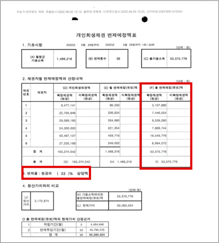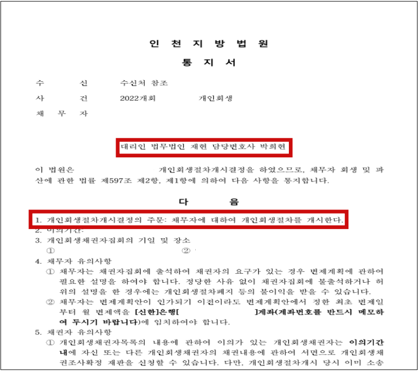 신청인의 경우 채무금액이 과다하였고, 배우자의 금융계좌 거래내역서 및 입출금 내역까지 상세히 소명하라는 법원의 권고가 있었습니다. 또한 최근 취업으로 인해 소득 확인이 정확하지 않은 부분에서 재차 권고가 있었으나 급여명세서, 은행거래내역 등 급여자료를 명확히 요약 후 제출하여 법원에서 원금의 67%를 탕감받는 계획안으로 접수일 기준 4개월이 조금 넘은 시점에 빠른 개시결정을 받을 수 있었습니다.