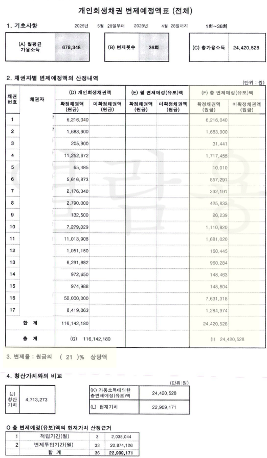 표00변제기간(36개월/3년)총 채무116,142,180원변제금692,192원총 변제금24,420,528원탕감금액91,721,652원원금의 79% 탕감