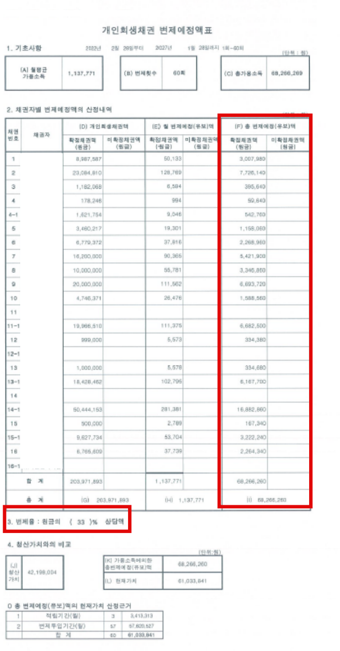 박00변제기간2022년 2월 ~ 2027년 1월(60개월/5년)총 채무203,971,893변제금1,137,771총 변제금68,266,260탕감금액135,705,633원금의 67% 탕감  박00님은 사업을 시작하기전 약국에서 안정된 소득을 발생시키고 있었습니다. 일을 하는 중에도 본인 사업에 대한 소망이 있었는데 마침 지인으로부터 카페창업 권유를 받아 잘할 수 있겠다라는 자신감 하나로 사업을 시작하였습니다. 사업 시작부터 대출을 받았으며 시작시에는 탄력을 받아 사업이 잘 진행되는 것 같았지만 몇 개월 채 지나지 않아 대출금을 갚기도 어려울 정도로 사업이 악화되었습니다. 사업이 어려우니 모든 물품등을 카드로 결제하게 되었으며 채무가 채무를 낳는 악순환이 시작되었습니다. 코로나 19바이러스로 인한 국가지원금까지 수령하였지만 이미 채무가 너무 과다한 상태에서 더 이상 버티지 못하고 개인회생을 신청하게 되었습니다.