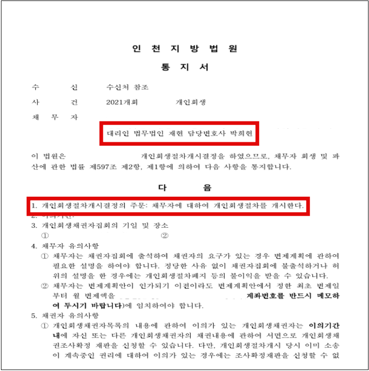 신청인의 경우 채무증대 경위를 구체적으로 소명하고, 퇴직금 사용내역 및 이전 사업장 폐업당시의 자산까지도 하나하나 소명하라는 법원의 까다로운 권고가 있었습니다. 그러나 저희 로펌만의 노하우로 노련하게 답변하여 보정권고 단 한번으로 빠르게 개시결정을 받을 수 있었습니다.