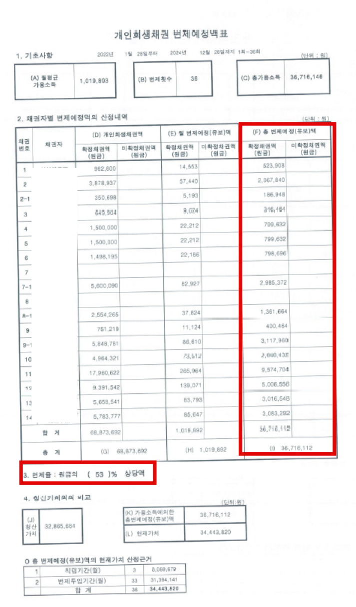 신청인의 경우 회생 신청 3개월 전에 취업을 하였습니다. 신청인 외의 배우자와 관련된 보정권고가 내려졌으나 배우자의 협조가 어려운 상태여서 개시결정이 늦어지게 되었습니다. 법원에서는 채무자의 현재 어려운 상황을 참작하여 36개월로 진행되게 되었으며 변제율 또한 원금대비 82%로 탕감이 매우 많이 되는 변제계획안으로 개시결정이 내려지게 되었습니다.