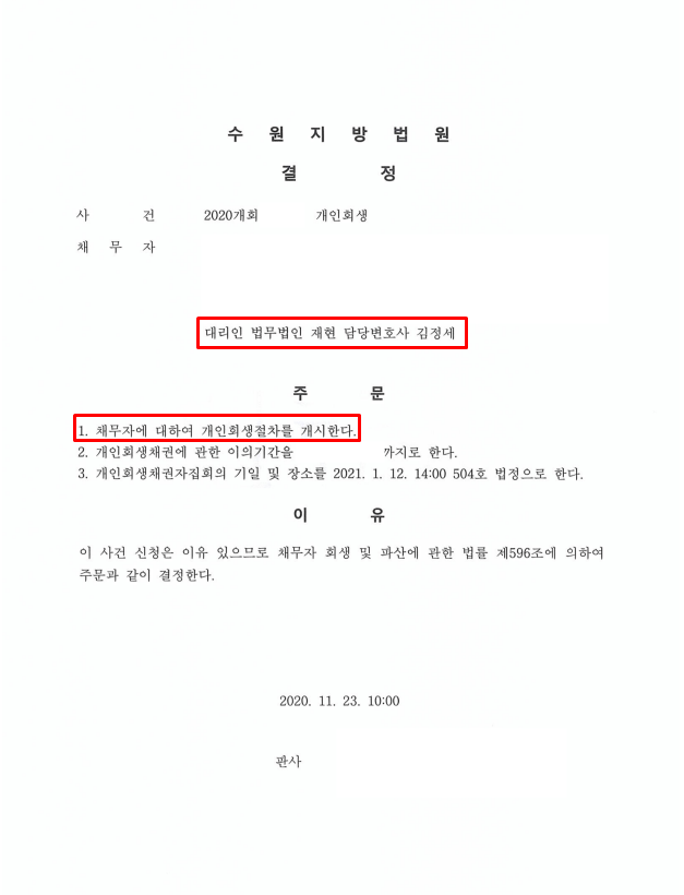 신청인의 경우 현재 거주하고 있는 임차지 외 소유 부동산이 있으나 해당 부동산은 부모님이 거주하고 있는 점을 주장해 현 거주지에 대해서는 주거용 임차보증금 반환청구권에 대한 면제재산이 인정되었습니다. 또한 개인채권자에게 별도로 상환한 금액에 대해서도 입출금내용을 잘정리하여 청산가치에 반영하지 않았으며 한번의 보정권고로 인해 빠른 개시결정이 내려지 되었습니다.