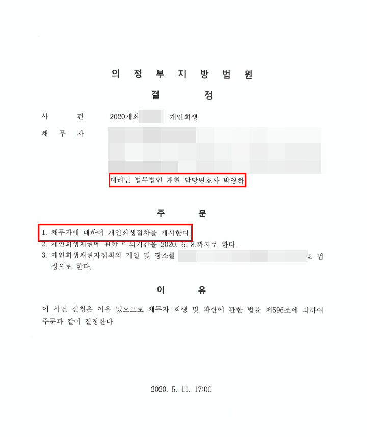 신청인의 채무는 불우한 가정환경으로 인하여 부족한 생활비를 충당하고자 대출을 받게 되었으며, 주식/도박/성형 등의 사치성 소비로 발생된 것이 아니었습니다. 이러한 점을 최대한 주장하였고, 법원에 개인회생을 접수한 후에 한 번의 보정권고를 통해 개시결정을 받게 된 사건이었습니다. 신청인은 근무를 시작한 지 한 달이 되지 않은 상태에서 개인회생을 신청하였으나, 앞으로의 소득이 일정한 것이라는 부분을 최대한 소명하여 개시결정까지 받을 수 있었습니다.