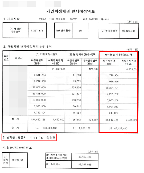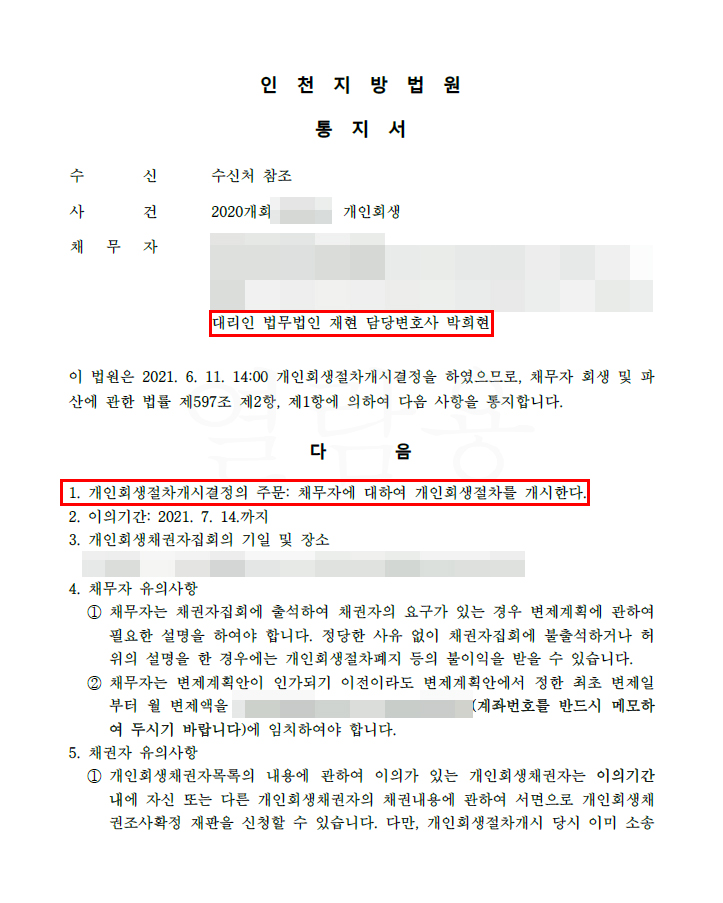 신청인은 자녀들을 좋은 환경에서 양육하기 위해 무리해서 대출을 받아 집을 매입하였습니다. 신청인의 소득으로는 대출이자 및 자녀 양육비로 충당하기엔 너무 부족했고, 더군다나 배우자는 자녀들을 양육하기 위해 경제활동도 못하고 있는 상황이었습니다. 대출금 대부분이 아픈 자녀의 병원비 및 생활비로 사용되었다는 점, 배우자의 소득이 없고, 신청인의 소득도 많지는 않지만 꾸준히 소득이 있다는 점을 법원에 소명하여 이를 통해 원금 69%가 탕감되는 변제계획안으로 개시결정을 받을 수 있었습니다.