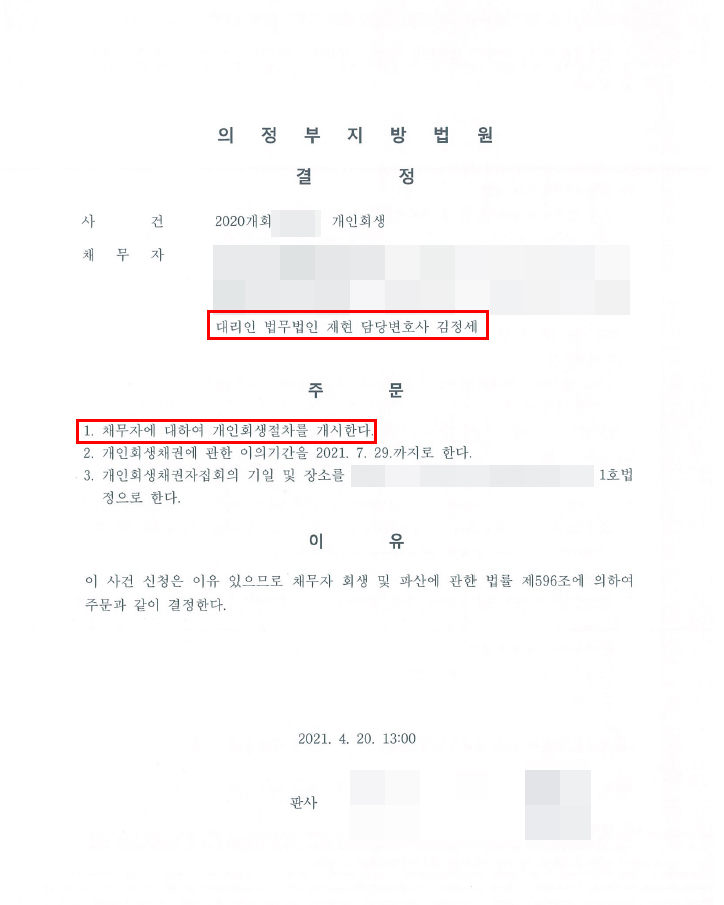 신청인의 채무는 주식, 도박, 성형 등의 사치성 소비로 발생된 것이 아니며 본인과 가족의 의료비 및 생활비가 부족하여 대출을 받게 된 것입니다. 이러한 점을 최대한 소명하였고, 법원에 개인회생을 신청접수한 후에 한 번의 보정권고를 통해 개시결정을 받게 된 사건이었습니다. 다수 채권자의 이의신청이 있었으나, 신청인은 개인회생 개시를 받을 수 있는 조건임을 주장하여 문제없이 개시결정까지 받을 수 있었습니다.