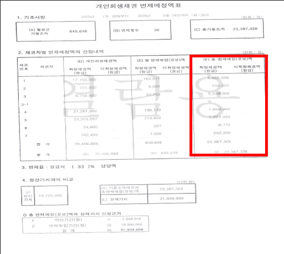 변제기간(36개월/3년)총 채무70,496,968원변제금649,648원총 변제금23,387,328원탕감금액47,109,640원원금의 67% 탕감