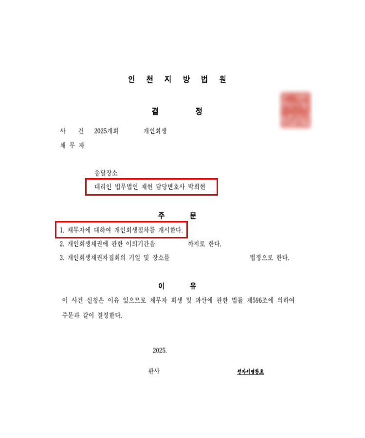 이러한 노력으로 법원은 신청인의 사정을 충분히 인정하였고 그 결과, 원금의 78% 탕감되는 변제계획안의 개시 결정을 받을 수 있었습니다.