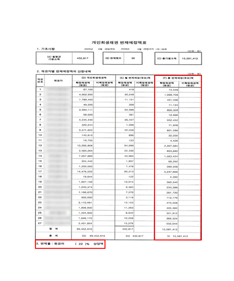 아울러 법원의 실질적 급여 확인 요구에 따라, 실제 급여와 소득 현황이 법원에 정확히 반영될 수 있도록 급여명세서 및 입금내역과 교차 확인하며 변제계획 수립에 필요한 자료를 보강하였습니다. 특히 각 자료 간 불일치 가능성을 최소화하기 위해 내부 검토를 수차례 진행하였습니다.
