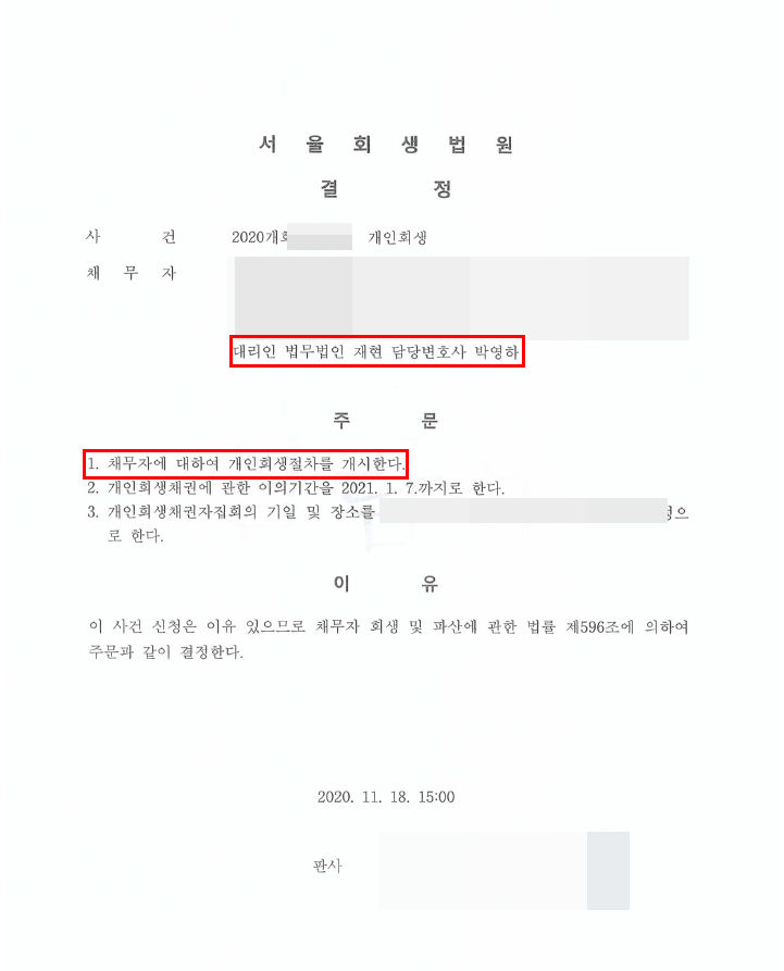 몇 년간 외벌이로 채무변제는 물론 생활비를 마련하기 위한 노력들을 진술서로 작성하여 소명자료와 같이 제출되었습니다. 현재는 연봉협상으로 안정적인 직장에 근무하고 있고 다만 배우자가 현재 연락두절로 자녀를 신청인이 부양하는적으로 2인가구로 작성하여 변제계획안을 제출하였습니다. 그 후 법원의 필요서류를 첨부하여 답변한 결과 높은면책율과 빠른개시결정을 무사히 받을 수 있었습니다.