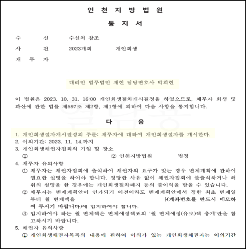 ※ 신청접수 : 2023.09.15 / ※ 금지명령 : 2023.09.18 / ※ 개시결정 : 2023.10.31