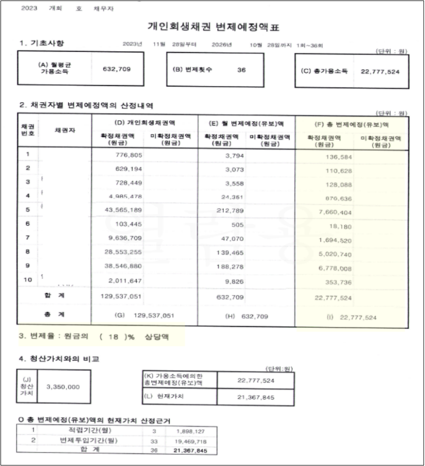 신청인의 경우 사실혼의 관계로 혼인관계증명서 상 혼인관계가 나타나지 않아 부양가족에 관하여 법원의 까다로운 권고가 있었으나 가족관계증명서, 진술서, 배우자의 금융계좌 거래내역서 등을 바탕으로 신청인의 상황을 자세하게 소명하여 미성년 자녀들 모두 부양가족으로 인정받아 접수일 기준 2개월도 되지 않는 기간 안에 원리금 82%를 탕감받아 낮은 변제금과 높은 면책율의 계획안으로 개시결정을 받아낼 수 있었습니다.