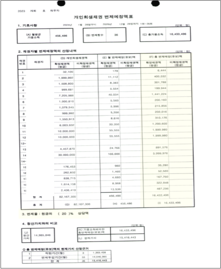 박00변제기간(36개월/3년)총 채무100,720,228원변제금456,486원총 변제금16,433,496원탕감금액66,345,238원원금의 80% 탕감