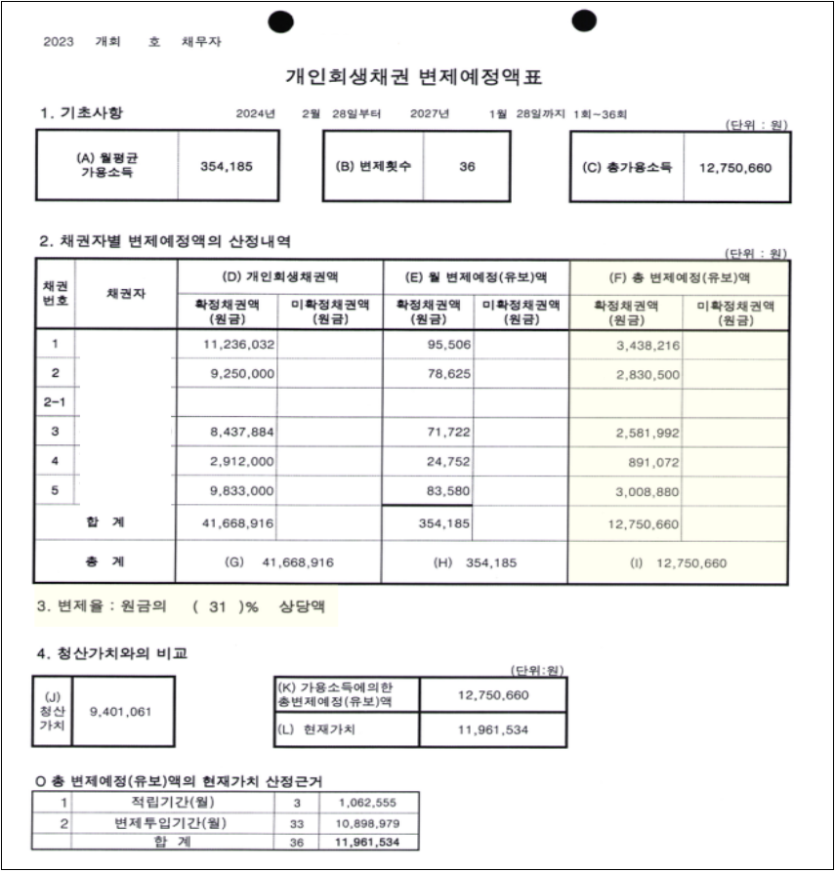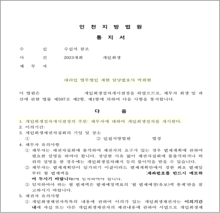 신청인은 최근채무의 비중이 전체 채무의 절반 이상으로 높은 편에 속했습니다. 또한 법원에서 모든 활동성 계좌의 거래내역서 뿐 아니라 최근 약 2년간의 신용카드 내역서 등 요청한 자료가 많았습니다. 실제 서류 양이 많아 검토해야 할 부분도 많았습니다. 이렇게 다소 신경쓸 부분이 많은 까다로운 권고였지만 저희 로펌만의 노하우로 침착하고 노련하게 답변하여 개인회생 신청 두 달도 채 되지 않은 시점에 원금의 69%를 탕감받는 계획안으로 개시결정을 받을 수 있었습니다.