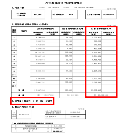 변제기간(44개월/3년8개월)총 채무112,337,398원 변제금801,385원총 변제금35,260,940원탕감금액77,076,458원원리금의 69% 탕감