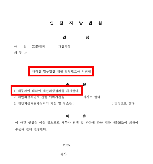 법원은 이러한 사정을 참작하여 개인회생 절차 개시를 결정하였고, 의뢰인은 합리적인 변제계획을 바탕으로 채무를 조정받아 가정과 생계를 다시 유지할 수 있는 기반을 마련할 수 있었습니다.